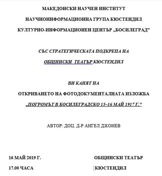 По същия повод на 16 май, от 17.00 часа, в Общинския театър в Кюстендил, Македонският научен институт – научно-информационна група „Кюстендил“ и КИЦ „Босилеград“ ще открият фотодокументална изложба „Погромът в Босилеградско 15-16 май 1917 г.“