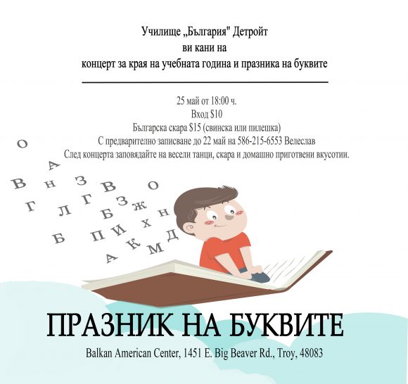 Училище „България“ – Детройт кани на концерт за края на учебната година и Деня на българската просвета и култура, и на славянската писменост. Концертът ще се състои на 25 май, събота, от 18.00 часа, в Balkan American Center.