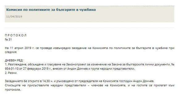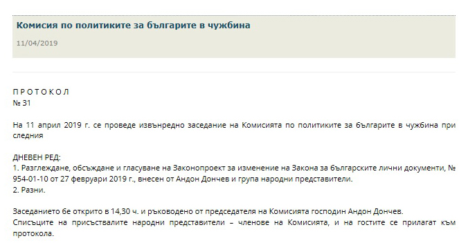 На 11 април т.г. се провежда извънредно заседание на Комисията по политиките за българите в чужбина към Народното събрание, при следния дневен ред: 1. Разглеждане, обсъждане и гласуване на Законопроект за изменение на Закона за българските лични документи, № 954-01-10 от 27 февруари 2019 г., внесен от Андон Дончев и група народни представители; 2. Разни. Законопроектът, който вече е бил разгледан от друга парламентарна комисия – тази по вътрешна сигурност и обществен ред, предлага малка промяна в Закона, касаеща срока на валидност на задграничните паспорти, с цел уеднаквяване сроковете с останалите документи – шофьорските книжки и личните карти. Предложението е срокът от 5 години да се удължи на 10 години. След кратка дискусия, членовете на Комисията одобряват Законопроекта.