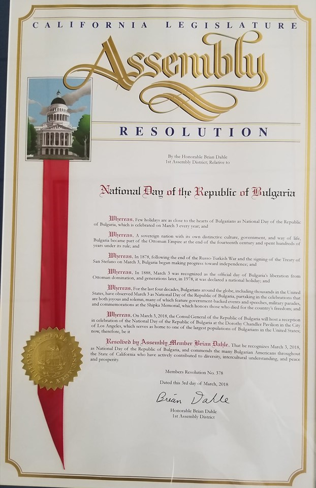 По-долу може да се види Резолюцията на California State Assembly във връзка с Националния празник на Р. България.