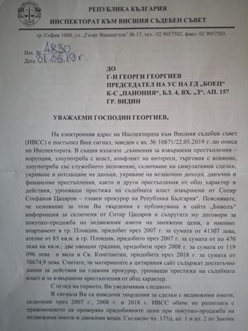 На 7.06.2019 г. ИВСС ни уведоми, че е образувана проверка срещу Цацаров по сигнала на БОЕЦ, като позовавайки се на ЗСВ, Инспекторатът обявява, че проверкате ще обхване само декларираното имущество на Цацаров, придобито след 2016 г. Именно в този период попада и прословутата вила разкрита от биволите.