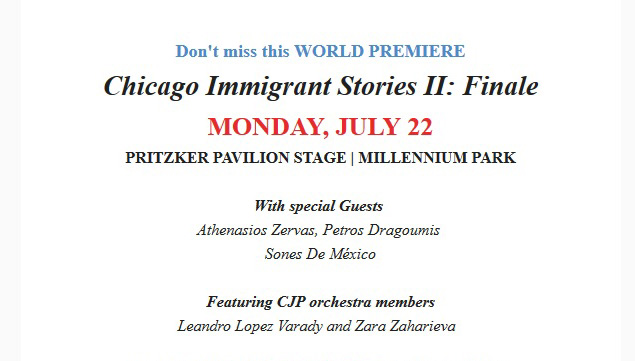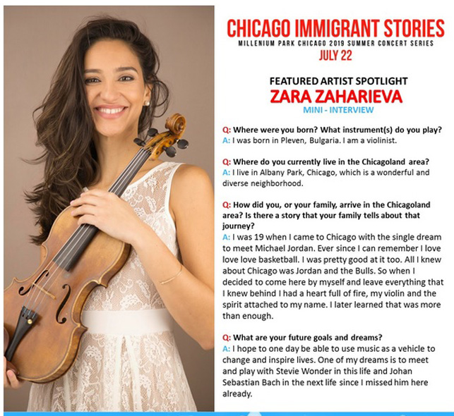 На 22 юли 2019 г. в Чикаго предстои културно събитие с българско участие – на цигуларката ЗАРА ЗАХАРИЕВА. Организатор на събитието, което ще се проведе в Милениум парк, е ЧИГАСКАТА ДЖАЗ-ФИЛХАРМОНИЯ (Chicago Jazz Philharmonic). Сред организациите, подпомагащи “ЧИГАСКИ ИМИГРАНТСКИ ИСТОРИИ II: ФИНАЛ”, е и Българското генерално консулство в Чикаго.