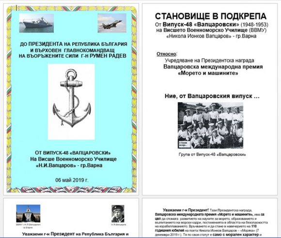 Становище от Випуск ’48 „Вапцаровски (1948-1953)” на Висшето военноморско училище „Никола Йонков Вапцаров” гр. Варна, в подкрепа за учредяване на Президентска награда Вапцаровска международна премия „Морето и машините” (вж. Становището тук – 10 12 VAPTSAROV PRILOJENIE 2)