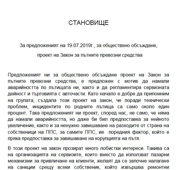 „Нашето мнение по така предложения ни проект на Закон за пътните превозни средства е, че евентуалното приемане на този закон: