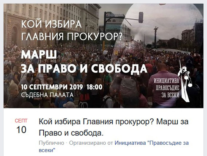 Инициатива „Правосъдие за всеки“ организира на 10 септември т.г. в София протестно шествие под надслов „Кой избира главния прокурор? Марш за право и свобода“. Шествието ще започне от Съдебната палата и ще завърши пред Народното събрание. Протестът е с начален час 18 ч. местно време и е планиран да завърши към 20.30 ч.
