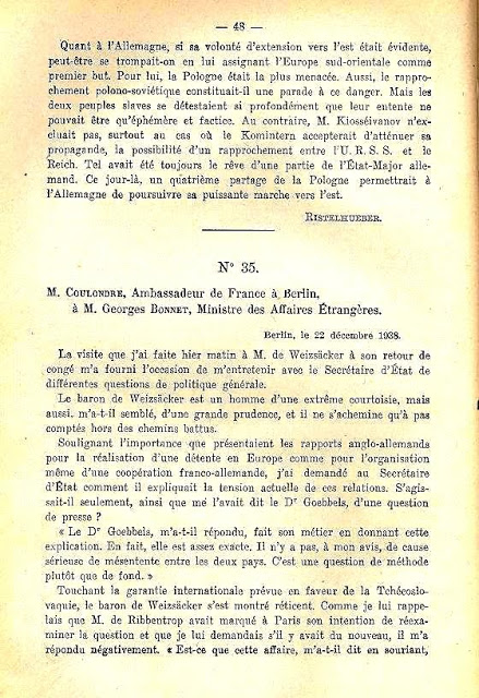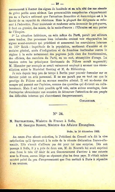 Френската жълта книга за събития непосредствено преди войната съдържа още в първите страници една телеграма за разговор на френския пълномощен министър Анри Ристелюбер с министър-председателя Георги Кьосеиванов, който с особена ясновидност пръв предрича едно евентуално споразумение между нацизма и болшевизма, което ще има за резултат нова подялба на Полша.