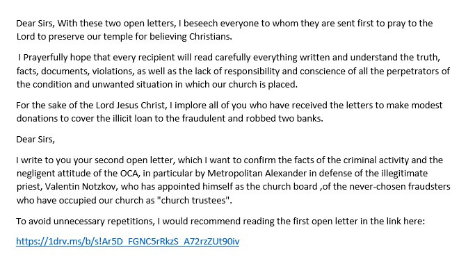 Пиша Ви второто си отворено писмо, с което искам да потвърдя фактите за престъпната дейност и небрежното отношение от ОСА, в конкретност от Митрополит Александър, в защита на нелегалния, представящ се за ”свещеник” Валентин Ноцков, който сам е назначил като тръстии никога не избираните измамници, окупирали нашата църква, като „църковни настоятели“.