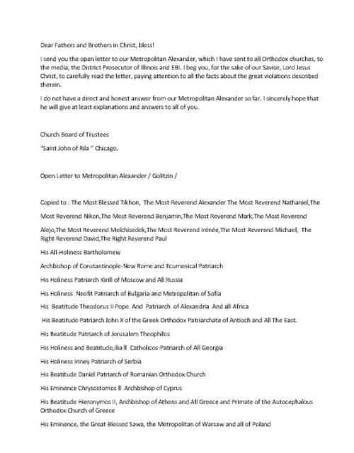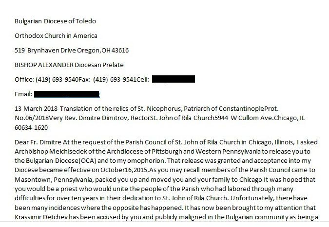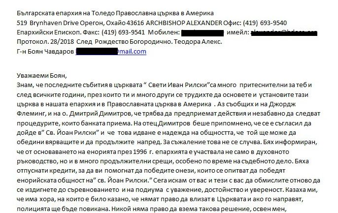 Сегашният свещеник в нашата църква е първият законен свещеник от 16 октомври 2015 година. Сегашните президент и настоятелство на църквата са първите легално избрани членове от първото законно и канонично проведено събрание от сегашния законен свещеник, извършено и ръководено от него на 18 ноември 2017 година. Предишното събрание от 16 ноември 2016 година, проведено самоинициативно от Митрополит Александър, не беше законно, а антиканонично, лъжовно и с нечестно намерение за прикриване на извършените престъпления от Ноцков през изминалите 20 години. Събранието за избор на новите настоятели, проведено от Митрополит Александър на 16 ноември 2016 година, остави дълбока рана и огромно разочарование всред българските християни в Чикаго, които напълно оправдано спряха да посещават храма ни с условието че ще се върнат пак отново, ако Митрополит Александър си подаде оставката. Митрополит Александър и до днешна дата отказва да поеме личната си отговорност за състоянието на нашата църква. Американската православна църква и нейният глава Митрополит Тихон, заедно с всички предишни Митрополити – Теодосий, Херман и Йона, носят абсолютната виновност за състоянието на нашата църква и разочарованието на 300 000 българи християни, живеещи в Чикаго. С прикриването на факта, че Валентин Ноцков не е свещеник, и допускането му да служи и да извършва незаконни църковни кръщения, венчавки и погребения, те са нарушили всички църковни и граждански закони. С всички изказани от тях лъжи, липса на финансов и духовен контрол, пълна неглижираност и бягане от отговорност, те не могат да се наричат „Свети Синод“. Цялото българско християнско общество от Чикаго настоява Американската православна църква да заплати незаконния заем, взет от двете измамени банки от прикривания от тях Валентин Ноцков. Ние публикуваме тук лъжливите и взаимно противоречащи си писма на Митрополит Александър до виновниците за измамването на двете банки. Ние настояваме призовката за първото съдебно дело да бъде изпратена лично до Митрополит Александър и Валентин Ноцков, като се надяваме почитаемият съд да не се задоволи само с присъда за възвръщане на нелегално взетите средства от тях, но и с пълна забрана за всякакво негово Епископско водителство и всякаква негова бъдеща духовна дейност. Митрополит Александър през цялото време на отношенията си с нашата църква действаше антиканонично и наруши всички норми на поведение с лъжи, нарушения на църковни, граждански и морални закони. Прилагам писмата, написани от него до сегашния легален наш свещеник и до фалшивите, назначени от Ноцков „президент“ Боян Чавдаров и „касиер“ Красимир Дечев. Всяко писмо е тълкувано и има обяснение. В тези писма Митрополит Александър, чрез изказванията си доказва, че е съучастник в престъпленията, и чрез подбуждането на виновниците към хулигански действия не е достоен да бъде повече наш Епископ.