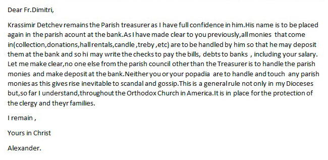 За писмото, в което Митрополит Александър „преназначава“ незаконния касиер Красимир Дечев, може да прочетете тук: