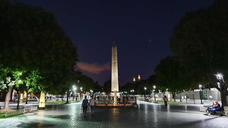 Градът ме успокоява, въпреки милионното си човешко стълпяване, въпреки залязващия ден, въпреки приканващите провиквания на търговците или предупредителното подрънкване на трамвая. Въпреки мъхнатите зидове на някогашната византийска столица, в които вградена, съвременността иска, настоява и живее. Истанбунопол или Константинобул? Изгубена в превода на преплетените му смисли, вървя с Невин след бурката на смрачаването, докоснала спокойната повърхност на площад „Султан Ахмед“, усещам под настилката му Хиподрума на византийските императори, снимам колоните, останали след тях, а златната половина на месеца, увисва като обеца върху централното кубе на Синята Джамия.
