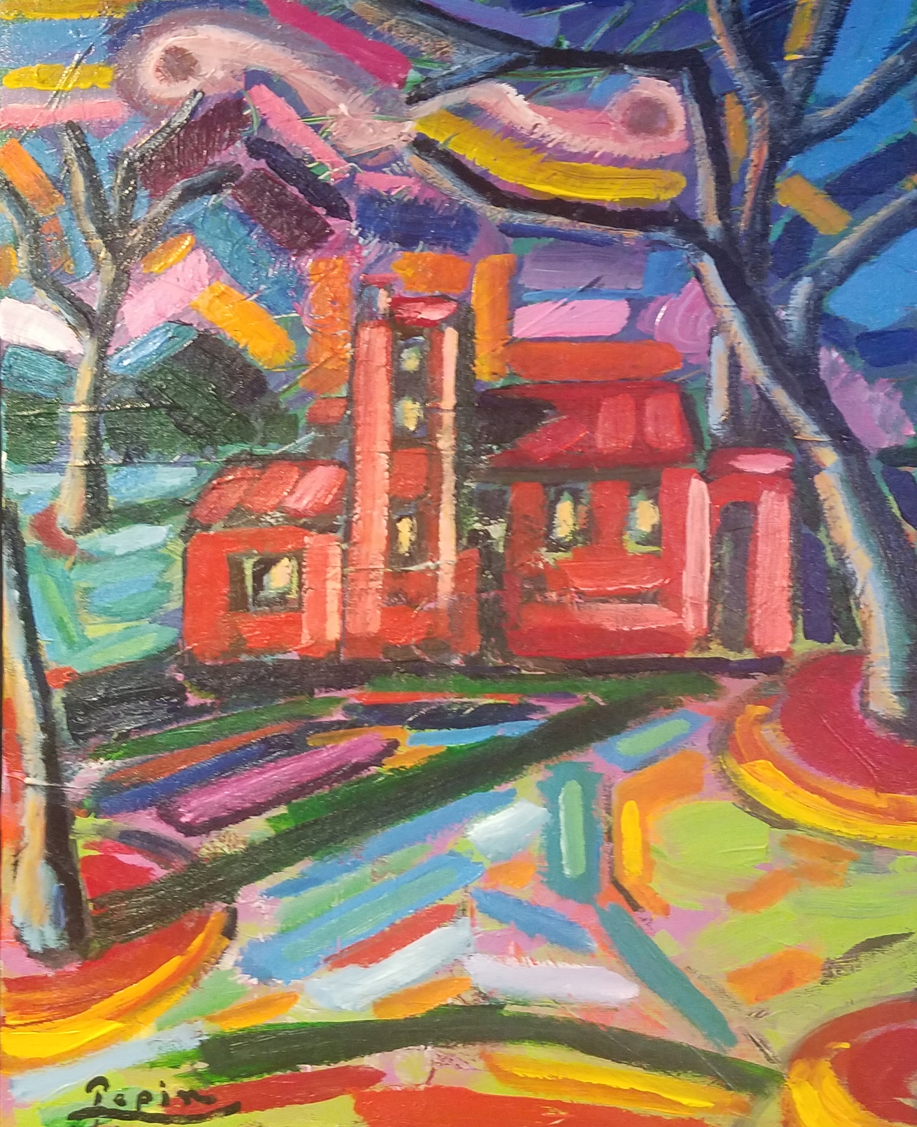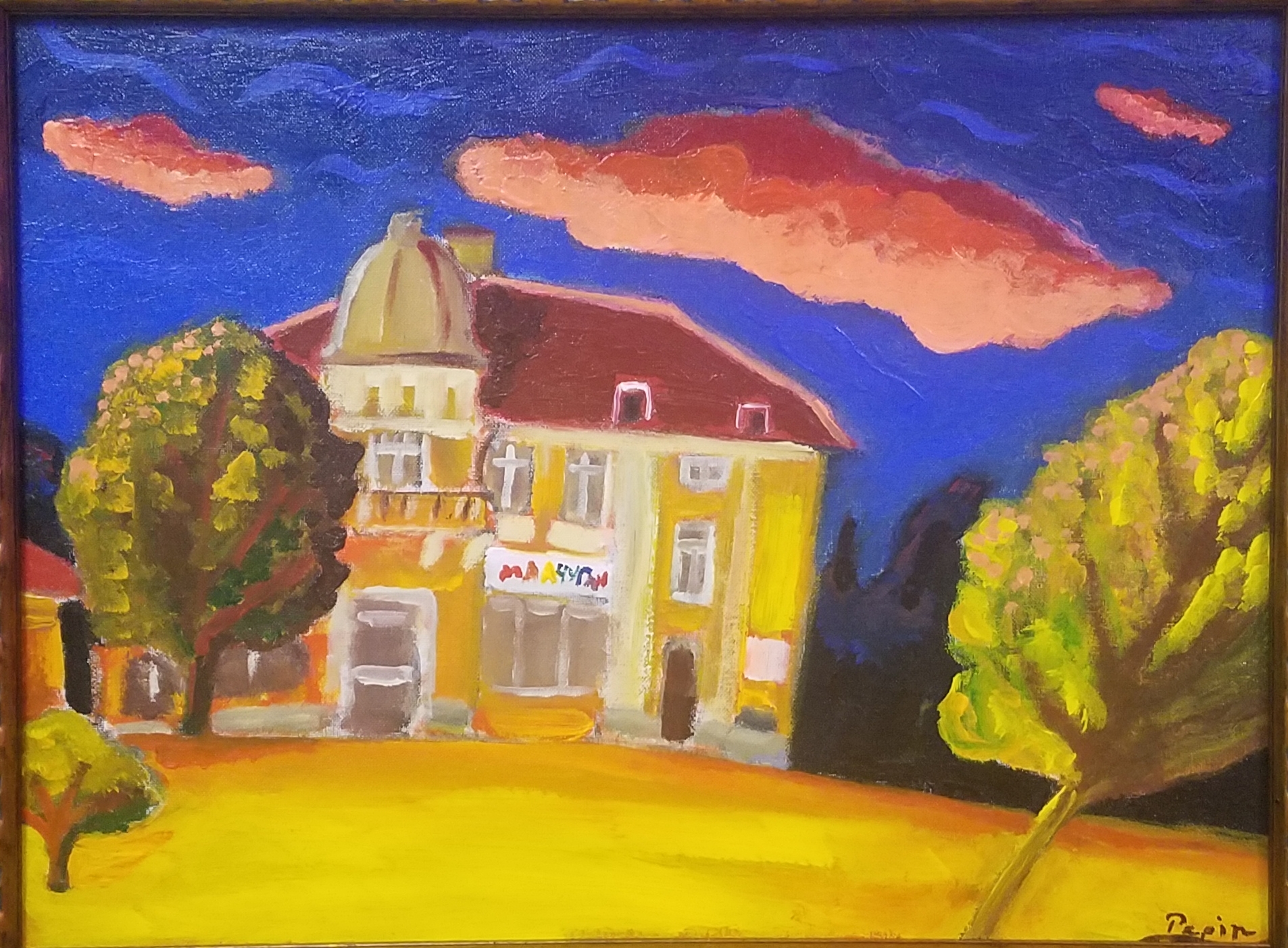 Вглеждам се в картините му, на откриването в Център „Магура“ в Чикаго – третата по ред самостоятелна изложба, откакто рисува, и първата, откакто е в Америка от 2016 г. – и се опитвам да разбера какво се крие зад тази каскада от мощен колорит, без да познавам нито автора, нито творчеството му. Самото заглавие на изложбата подсказва какво трябва да видим – „Червено и Синьо”. Не ни е подвел художникът. Залата вибрира от контрастни цветове, които могат да разбудят и най-заспалите сетива. Темите са толкова неочаквано противоположни, че докато се любуваш на червения облак от пейзажа с къщи, заставаш пред настръхнали петли в победна схватка или се отнасяш по музиканта в зелено. Не липсват картини и с битови мотиви: „На Чешмата”, „Розова долина”.