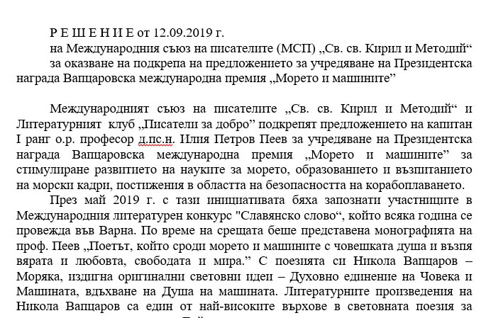 „Международният съюз на писателите „Св. св. Кирил и Методий“ и Литературният клуб „Писатели за добро” подкрепят предложението на капитан I ранг о.р. професор д.пс.н. Илия Петров Пеев, за учредяване на Президентска награда – Вапцаровска международна премия „Морето и машините”, за стимулиране развитието на науките за морето, образованието и възпитанието на морски кадри, постижения в областта на безопасността на корабоплаването.