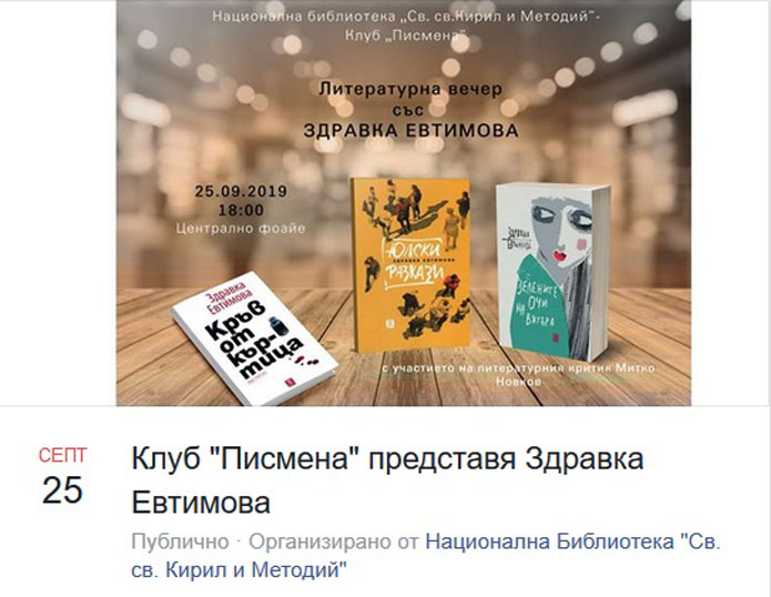 На 25 септември 2019 г. Клуб „Писмена“ представя писателката Здравка Евтимова. Литературната вечер, организирана от Националната библиотека „Св. св. Кирил и Методий“, ще започне в централното фоайе на библиотеката (бул. „Васил Левски“ 88) в София от 18 часа местно време утре и ще продължи до 19 часа.
