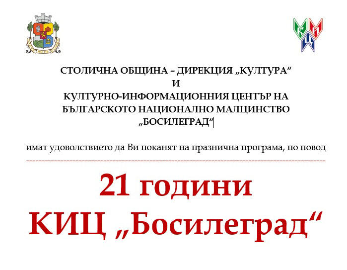 Столична община – Дирекция „Култура“ и Културно-информационният център на българското национално малцинство „Босилеград“ канят всички, които имат желание и възможност, на празнична програма, по повод 21 години от основаването на Центъра. Събитието е насрочено за 5 октомври 2019 г., събота, от 13:00 часа местно време, в салона на КИЦ „Босилеград“.