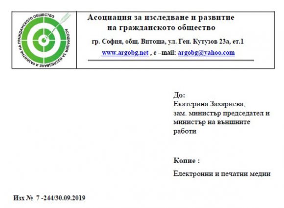 Асоциацията за изследване и развитие на гражданското общество е изпратила вчера обръщение до министъра на външните работи Екатерина Захариева, с копие до електронни и печатни медии. В обръщението се казва: