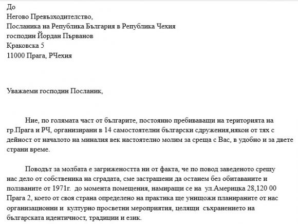 „Поводът за молбата е загрижеността ни от факта, че по повод заведеното срещу нас дело от собственика на сградата, сме застрашени да останем без обитаваните и ползваните от 1971 г. до момента помещения, намиращи се на ул. „Америцка“ 28, 120 00 Прага 2, което от своя страна определено на практика ще унищожи планираните от нас организационни и културно-просветни мероприятия, целящи съхранението на българската идентичност, традиции и език.