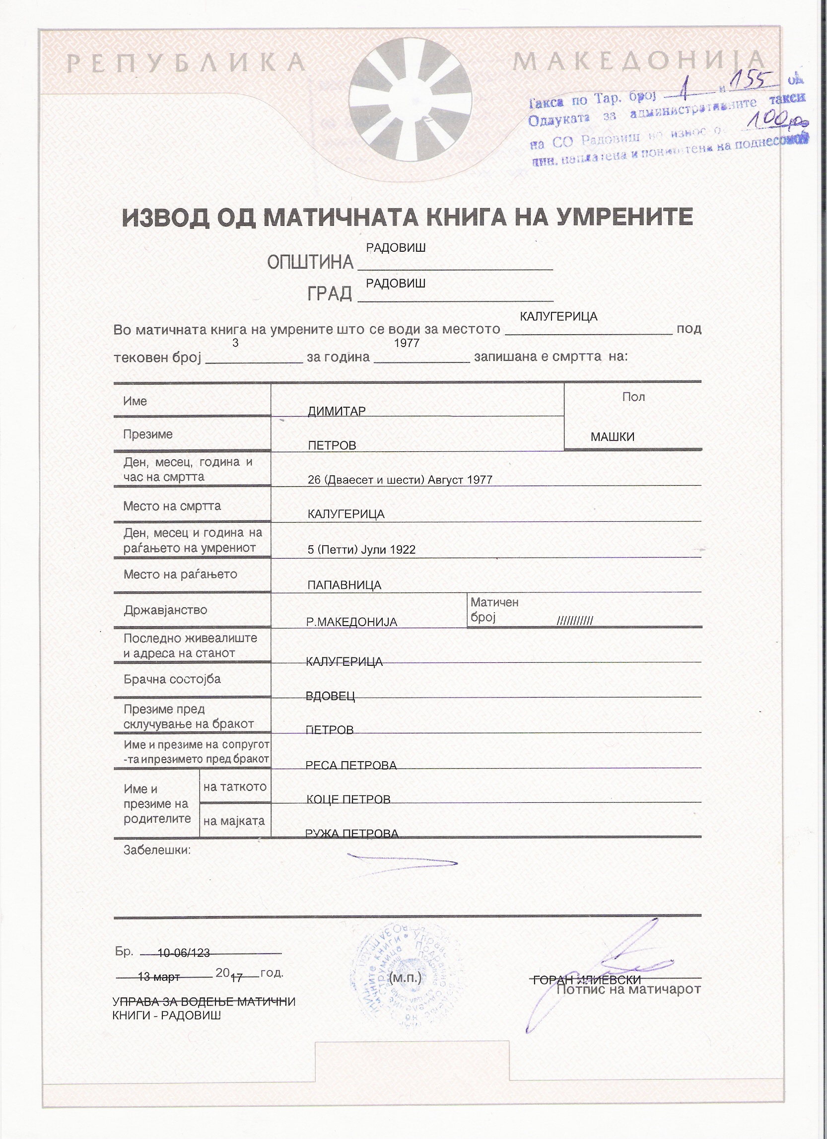3. Извод от Матичната книга за починалите в Община Радовиш, Р. Македония, за дядото на Драган – Димитър Петров, издаден през 2017 г. От документа се вижда, че Димитър е роден през 1922 г. в Папавница (за което пише, че било част от Р. Македония, но тогава е нямало Р. Македония, а Вардарска бановина на Кралство Югославия) и е починал в Калугерица, Община Радовиш, Р. Македония, през 1977 г. В документа е отразено и името на съпругата на Димитър Петров, изписана в него като Реса Петрова, както и имената на родителите на Димитър – Коце и Ружа Петрови.