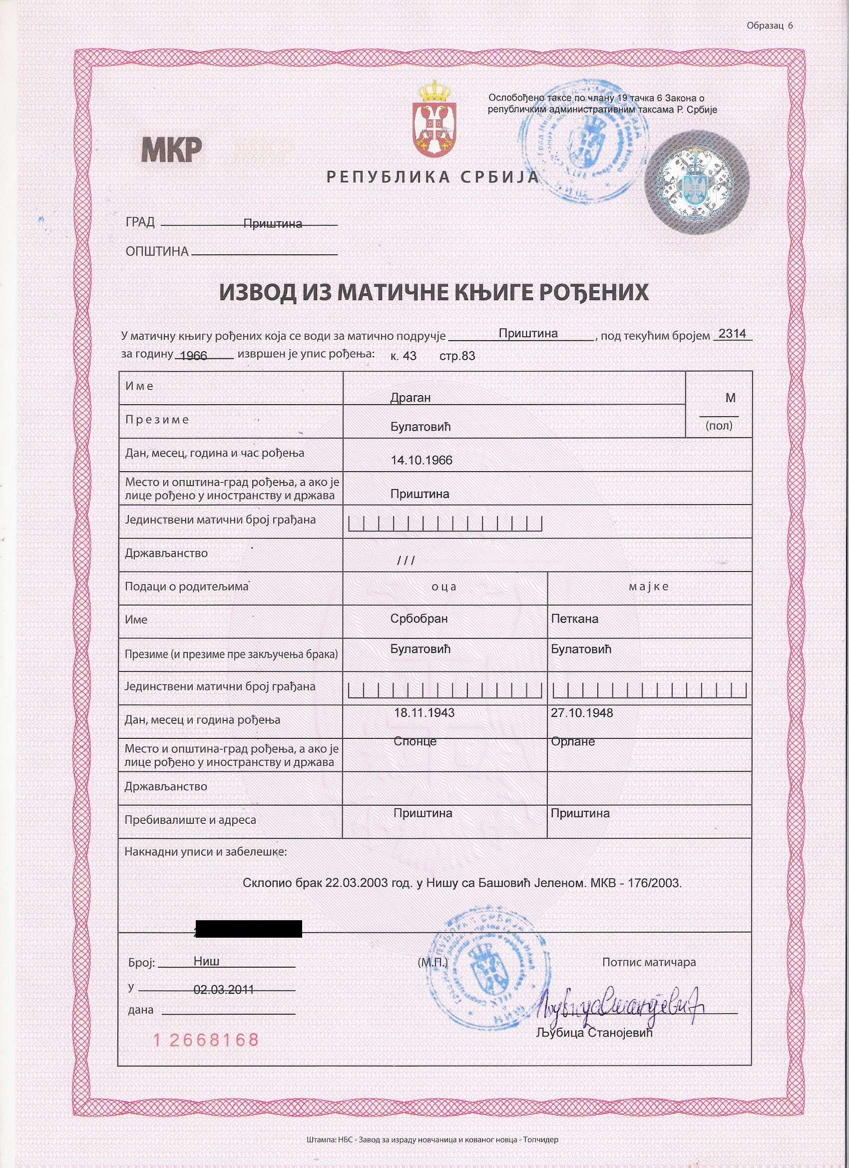 1. Извод от Матичната книга на родените в гр. Прищина, Р. Сърбия, издадено за Драган Булатович през 2011 г. От документа се вижда, че Драган е роден в Прищина през 1966 г., с родители Петкана и Србобран Булатович.