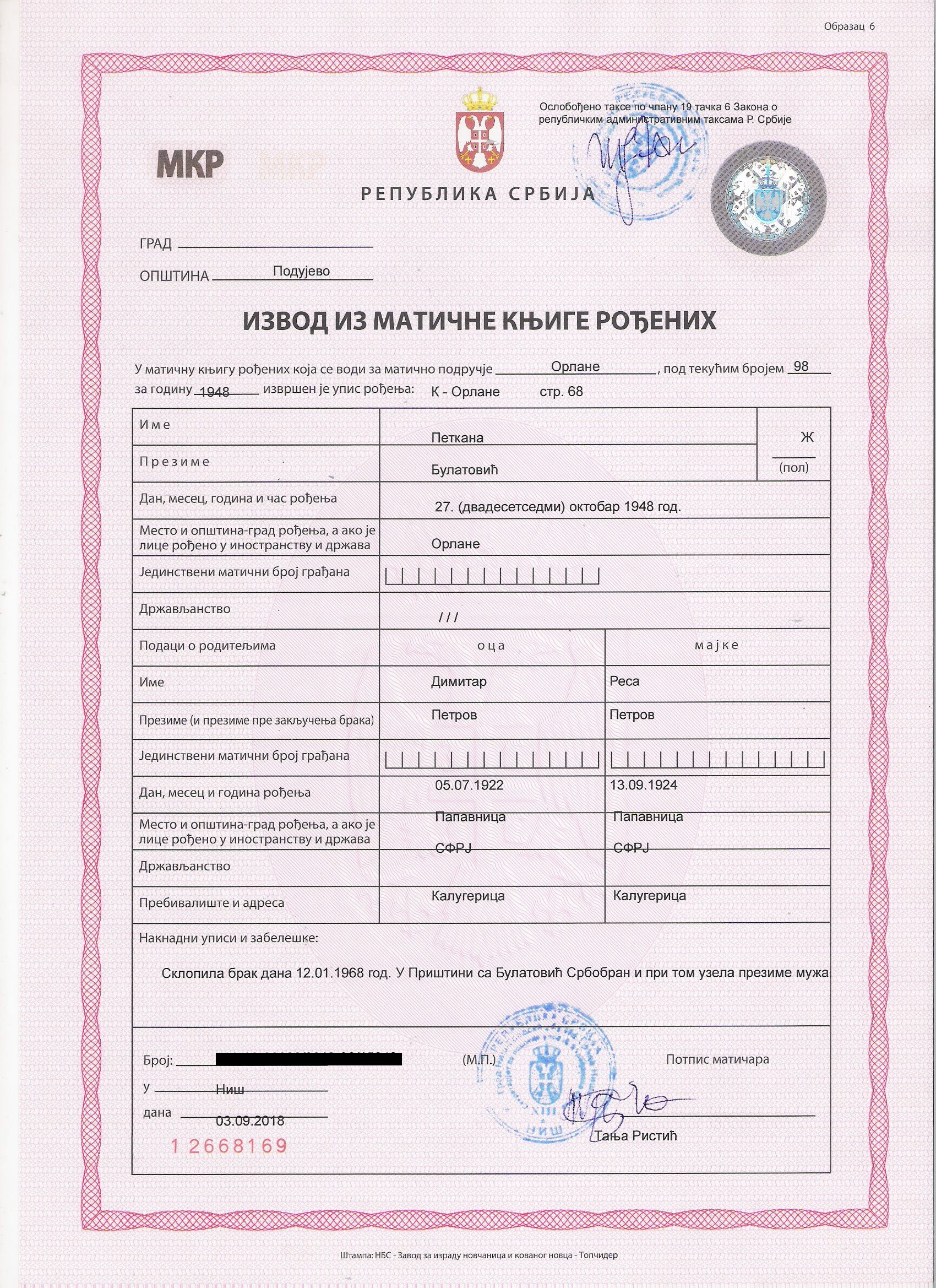 2. Извод от Матичната книга на родените в Община Подуйево, Р. Сърбия, за майката на Драган – Петкана Булатович (това е фамилията й по съпруг), издаден през 2018 г. От документа се вижда, Петкана е родена в Орлане през 1948 г., с родители Димитър Петров и Реса Петров (не Петрова, понеже такава е била практиката за женските фамилни имена в СФР Югославия, както и по-късно, в Р. Сърбия), както и, че родителите на Петкана са родени в с. Папавница, СФРЮ. (Което е неточно – когато са се родили дядото и бабата на Драган – Димитър и Реса през 20-те години на ХХ век, не е имало СФР Югославия, държавата е била е Кралство Югославия.)