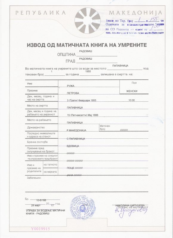 4. Извод от Матичната книга на починалите в Община Радовиш, Р. Македония, за прабабата на Драган – Ружа Петрова, майка на дядо му Димитър, издаден през 2017 г. От документа се вижда, че Ружа е родена в с. Папавница през 1888 г. (за селото пише, че е било част от Р. Македония, но когато Ружа се е родила в Папавница/Поповница, държавата не е била Р. Македония, а Османска империя и селото е било в Радовишка кааза) и е починала през 1955 г. в същото село (което тогава вече е било част от Р. Македония, като една от съюзните републики в СФРЮ).