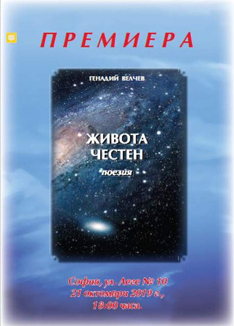 На 21 октомври т.г., от 18.00 ч. местно време, в София ще се състои премиера на поетичната книга на Генадий Велчев „ЖИВОТА ЧЕСТЕН“. Авторът и изд. „Никола Вапцаров“ канят приятели и почитатели на литературата на събитието, което ще се състои на адрес ул. „Леге“ № 10.