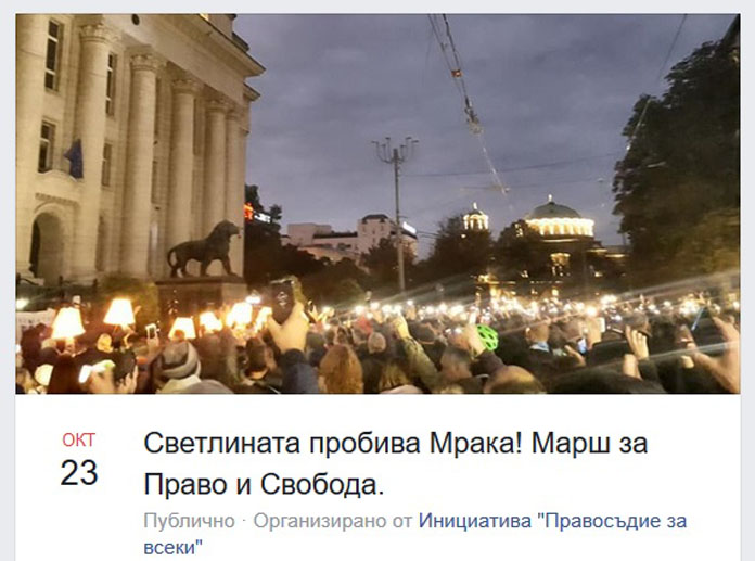 „На 24 октомври е финалното изслушване на единствения кандидат за Главен прокурор и така наречения избор във Висшия съдебен съвет. Загряват с искане за оставка на председателя на Върховния касационен съд Лозан Панов. Олигархията отдавна овладя Прокуратурата, а сега иска да стори същото със Съда, чрез готвеното назначение на кандидата на Делян Пеевски. Зависимостите и влиянията в Съдебната власт са вече явни, сега броят гласовете. Но ние сме готови да ги осветим и да се опитаме да ги възпрем, като организираме и жива верига със светлини и фенери в Триъгълника на властта на Ларгото, и кажем ясно, че не приемаме тази гавра с Правосъдието, правата и свободите ни!
