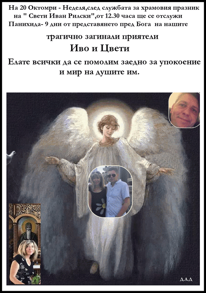 На 20 октомври 2019 г., неделя, след Светата литургия за храмовия празник на „Св. Иван Рилски Чудотворец“ в Чикаго, от 12.30 часа ще се отслужи панихида – 9 дни от кончината на трагично загиналите приятели Ивайло Попов и неговата съпруга Цветанка – съобщи свещеникът на храма отец Димитър. Те, както и майката на Ивайло – Искра и нейният приятел Дейвид, бяха убити на 12 октомври (вж. тук) в дома на Иво и Цвети в Чикаго.