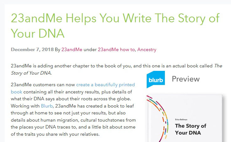 Днес, две десетилетия по-късно, всеки може да постави в своята библиотека книга с Историята на Своята ДНК. Това стана възможно благодарение на инициативата на една от водещите световни генетични компании със символичното име „23andMe.com“. През месец септември 2019 г. компанията съобщи на своите клиенти (които са приблизително 10 000 000), че чрез подизпълнителят Blurb Books издава във PDF формат „The story of Your DNA“.