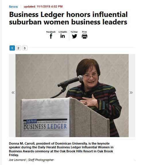 Keynote speaker Donna M. Carroll, president of Dominican University in River Forest, spoke of the qualities of leadership and how it’s done „without ego,“ but with a combination of skills, disposition, empathy and humor that builds the people and organization you oversee.