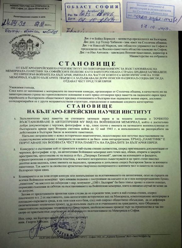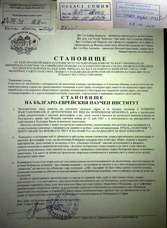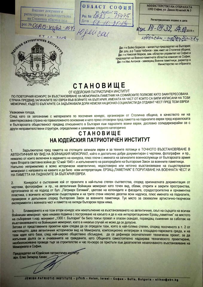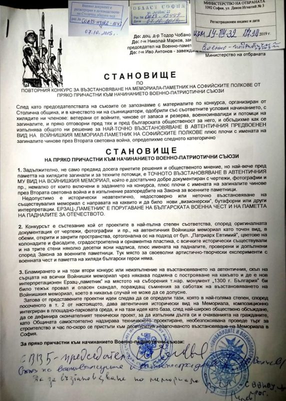 След като председателствата на съюзите се запознахме с материалите по конкурса, организиран от Столична община, и в качеството ни на съинициатори, одобрили със съответните условия начинанието, с хилядите ни членове: ветерани от войните, чинове от запаса и резерва, военноинвалиди и потомци на загиналите, и пряко отговорни пред тях и пред българската общественост за него, и обсъдихме как се изпълнява общото ни решение за най-точно възстановяване в автентичния ПРЕДВОЕНЕН вид на Войнишкия мемориал-паметник на софийските полкове, плюс плочи с имената на загиналите чинове през Втората световна война, определихме следното категорично