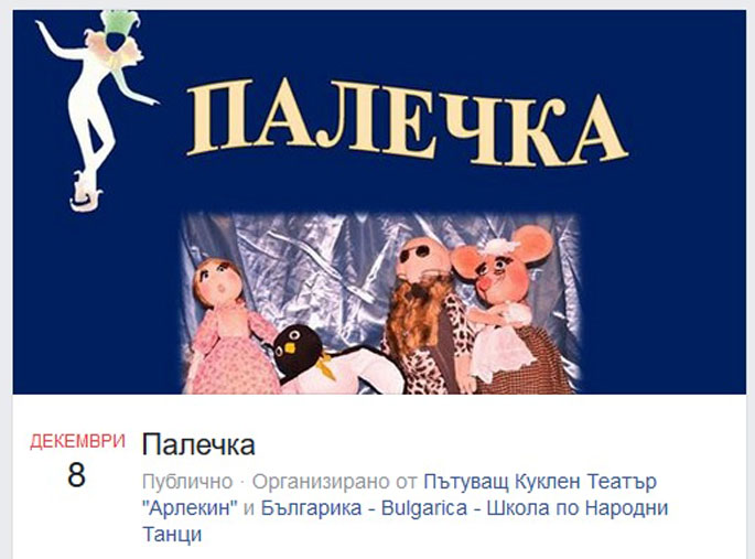 Пътуващ куклен театър „АРЛЕКИН“ и Център „БЪЛГАРИКА“ организират на 8 декември т.г. в Чикаго представление на пиесата „ПАЛЕЧКА“, по класическата приказка на Ханс Кристиан Андерсен.