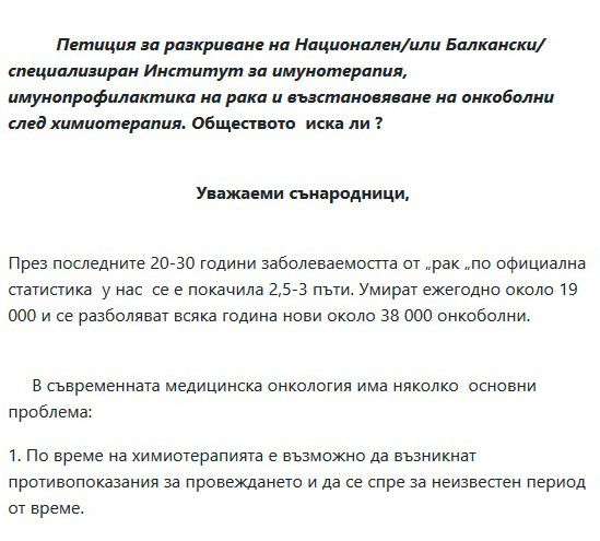 Петиция за разкриване на Национален/или Балкански/ специализиран Институт за имунотерапия, имунопрофилактика на рака и възстановяване на онкоболни след химиотерапия. Обществото иска ли?