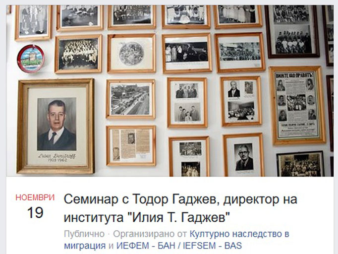 На 19 ноември 2019 г. (вторник), от 17:00 ч. до 18:30 часа местно време, в зала 19 на Института за етнография и фолклористика с Етнографски музей /ИЕФЕМ/ към БАН, ще се проведе семинар с Тодор Гаджев, директор на Института по история на българската емиграция в Северна Америка „Илия Т. Гаджев“.