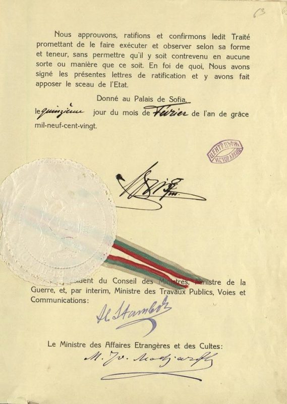 На 27.11.1919 г. в парижкото предградие Ньой-сюр-Сен (Neuilly-sur-Seine ) България подписва мирен договор с Антантата, военния съюз на държавите победителки в Първата световна война (САЩ, Великобритания, Франция, Италия и Япония), както и с техните съюзници, между които са съседните нам държави, с изключение на Турция. На снимката се виждат положените подписи на цар Борис III, министър-председателя Стамболийски и министъра на външните работи Михаил Маджаров.