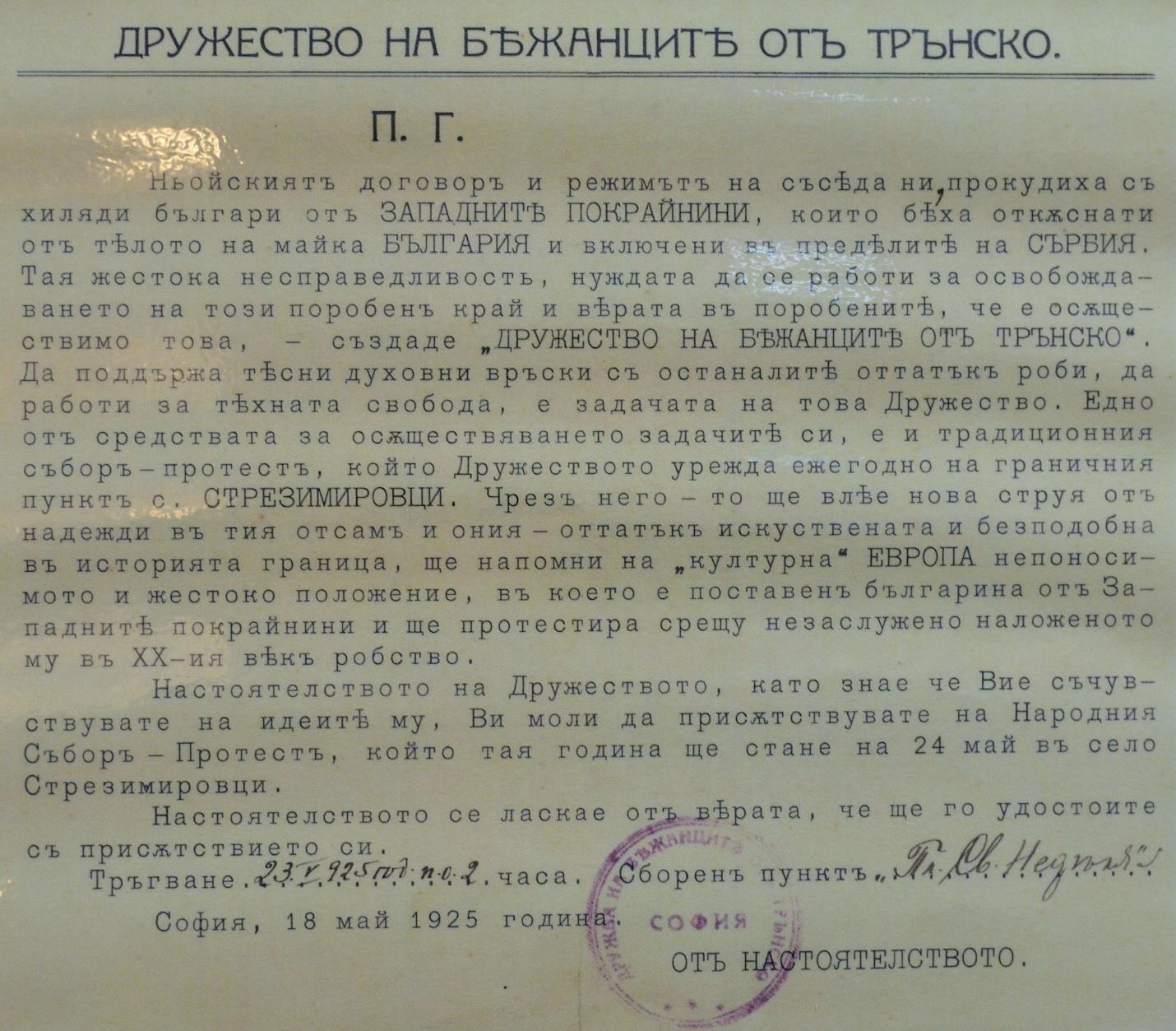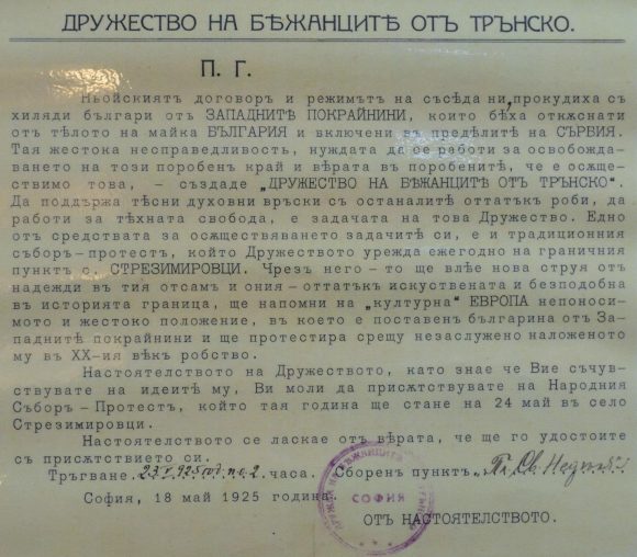През 1925 г. Дружеството на бежанците от Трънско насрочва събор-протест в граничното трънско село Стрезимировци, разполовено от ньойската граница.