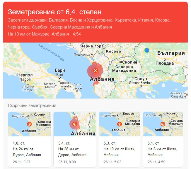 Земетресение с магнитуд 6,4 по Рихтер, с епицентър в Адриатическо море, на 10 км северозападно от гр. Шияк и на 34 км северозападно от столицата Тирана, разтърси Албания рано тази сутрин. В гр. Дурас, който се намира на 24 км от епицентъра, има големи поражения. Триетажен хотел е рухнал, засегнати са и други сгради. Електрозахранването е прекъснато в Дурас и на други места. Трусът е станал на дълбочина 10 км, усетен е и в съседни на Албания страни. Засега загиналите в Албания са най-малко трима. Над 70 души са били ранени. Те са настанени в спешните отделения в Тирана, съобщи Франс прес, позовавайки се на говорителка на албанското министерство на здравеопазването.