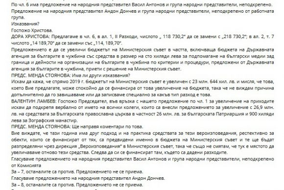 В предложението, внесено от председателя на Комисията по политиките за българите в чужбина при НС Андон Дончев и други народни представители, се предлага да се отпуснат 100 хил. лв. в бюджета на Министерски съвет, в частта за Държавната агенция за българите в чужбина, за частично подпомагане дейността на български организации и медии зад граница. Това предложение не е било подкрепено от работната група, то не се приема и при гласуването на заседанието на Комисията по бюджет и финанси. За него гласуват 8 членове на тази комисия, останалите са против.