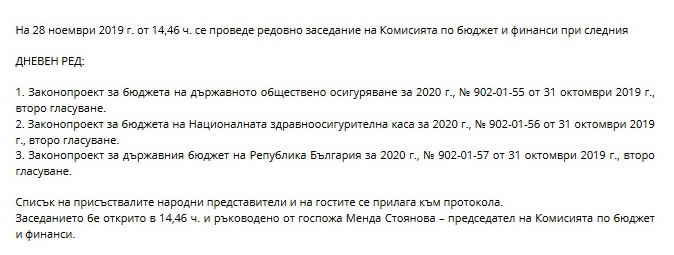 На 28 ноември 2019 г. се повежда заседание на Комисията по бюджет и финанси към Народното събрание, при следния дневен ред: „1. Законопроект за бюджета на държавното обществено осигуряване за 2020 г., № 902-01-55 от 31 октомври 2019 г., второ гласуване; 2. Законопроект за бюджета на Националната здравноосигурителна каса за 2020 г., № 902-01-56 от 31 октомври 2019 г., второ гласуване; 3. Законопроект за държавния бюджет на Република България за 2020 г., № 902-01-57 от 31 октомври 2019 г., второ гласуване“.