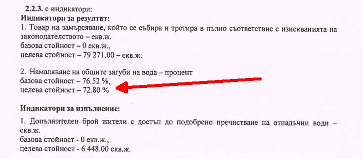 Но не по-малко интересно е какви са критериите в този договор за изпълнение на ремонтите и какъв ще е резултатът от тях! Четем и разбираме, че бенефициентът получава десетки, дори стотици милиони, за да намали загубите на водата от високите 76% до… изключително ниските 72% загуби (вж. снимката).