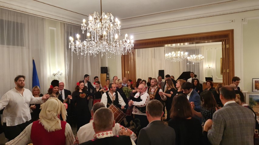 Тази година в посолството гостува и група кукери от с. Могила, Ямболско. Задумка тъпан, писна гайда, залюляха се тежки чанове, продъни се въздухът от ритъм и звън, и се хванаха всички на хоро, играно от езически векове до днес, за да се прогони всяко зло надалеч. Стъпи тежък кукер нависоко и провикна се в Бъдещето – да идва Здраве, Плодородие, Късмет.