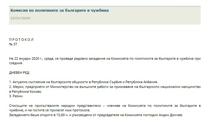 На 22 януари 2020 г. се състоя заседание на Комисията по политиките за българите в чужбина към Народното събрание, при следния дневен ред: „1. Актуално състояние на българските общности в Република Сърбия и Република Албания; 2. Мерки, предприети от Министерство на външните работи за признаване на българското национално малцинство в Република Косово; 3. Разни“.