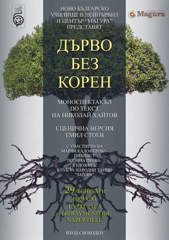 Ново българско училище в Нейпървил и Център „Магура“ ще представят на 29 февруари т.г., от 13 часа, моноспектакъла „ДЪРВО БЕЗ КОРЕН“. Представлението е по текст на Николай Хайтов, сценичната версия е на Емил Стоев. Събитието в Ново българско училище в Нейпървил ще се проведе с участието на Мария Калоферова – пианист, Полина Пеева – художник и Клуб за народни танци „Загора“. Входът е свободен.