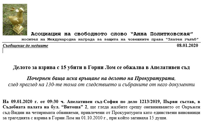 На 09.01.2020 г. от 09:30 ч. Апелативен съд-София по дело 1213/2019, Първи състав, в Съдебната палата на бул. “Витоша” 2, ще гледа жалбите срещу оневиняването от Окръжен съд – Видин на четиримата обвиняеми, привлечени от Прокуратурата като единствени виновници за трагедията с взрива в Горни Лом на 01.10.2010 г., при който загинаха 15 души.