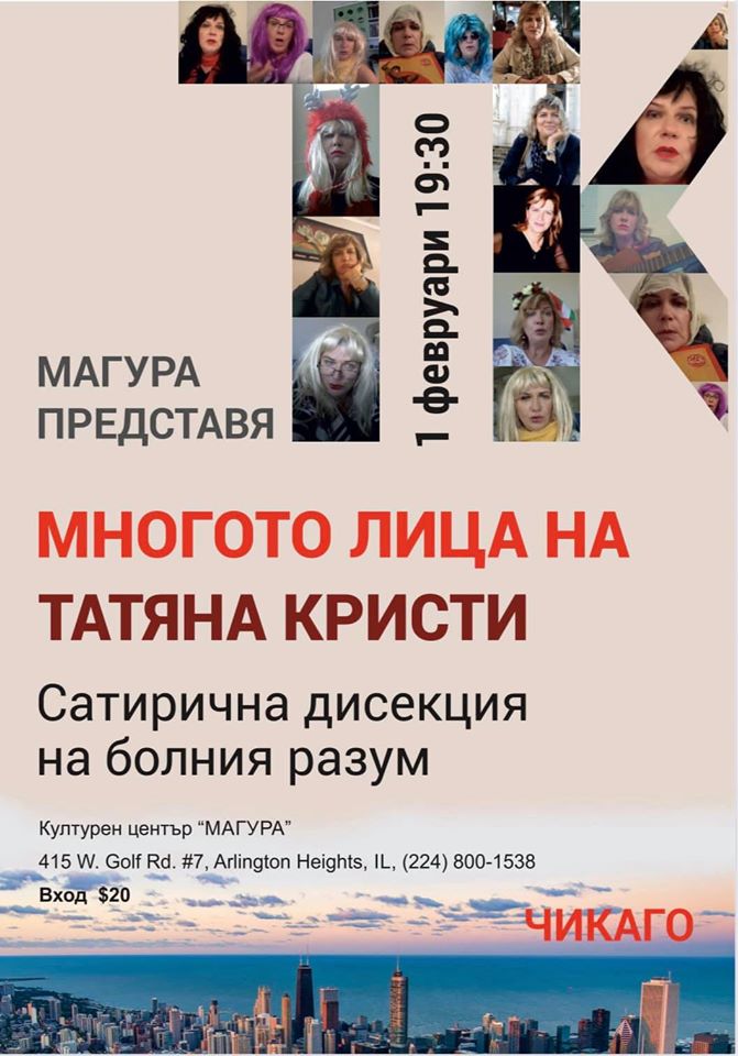Сатиричният моноспектакъл на Татяна Кристи се превърна в магнит за публиката в България и САЩ, защото хората, които посещават шоуто й, не спират да се заливат от смях. След успешни представления в Сан Франциско, София, Варна и Пловдив, дръзката журналистка ще гостува и в Чикаго. От една година Татяна Кристи пренесе скечовете си от интернет на театралната сцена – в мултимедийна продукция, която е уникална по рода си.