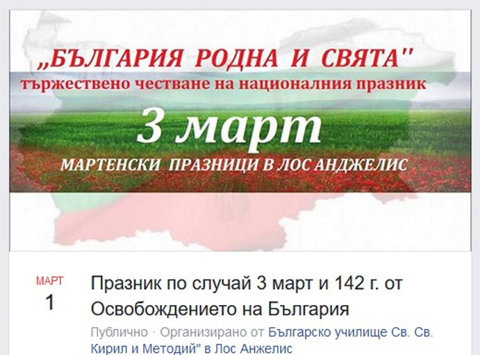 Българското генерално консулство и Българското училище „Св. св. Кирил и Методий“ в Лос Анжелис организират тържествено честване на Националния празник на България 3-ти март. Честването под надслов „България родна и свята“ ще се проведе на 1-ви март 2020 г., неделя, от 12.30 до 18 часа местно време, в Българско училище Св. св. Кирил и Методий“ в LA (Veterans Complex, 4117 Overland Ave, Culver City, California 90230).