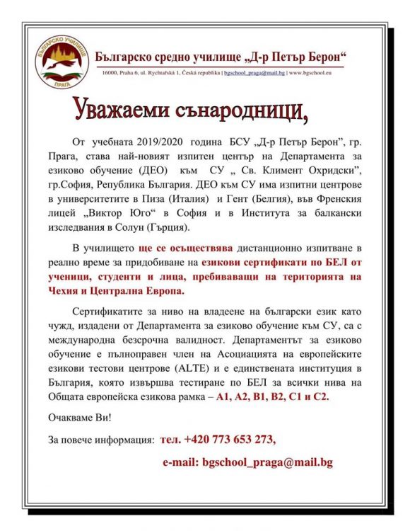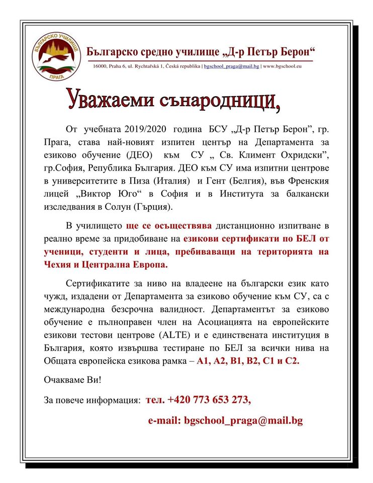 Българско средно училище „Д-р Петър Берон“ – Прага стана най-новият изпитен център на Департамента за езиково обучение (ДЕО) към СУ „Св. Климент Охридски“ – София, за изпитване и придобиване на езикови сертификати по български език от ученици, студенти и други лица, пребиваващи на територията на Чехия и Централна Европа. Повече информация – в съобщението на БСУ „Д-р Петър Берон“.