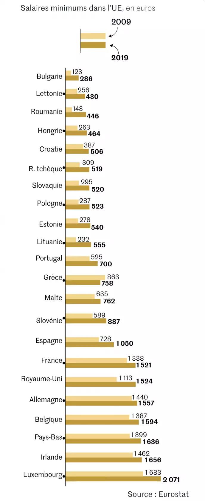 Вестник „Монд“ публикува наскоро статия за установяването на минимална работна заплата в Европейския съюз, за което Европейската комисия започна консултации. Вестникът публикува и таблица на Eurostat за минималните работни заплати в страните-членки на ЕС през 2009 г. и 2019 г. От данните се вижда, че нивото на минималните възнаграждения се разминава драстично, а България „води класацията“ с минималната си работна заплата и сега, и преди 10 години – съответно 123 и 286 евро. Най-високата минимална работна заплата е била и е тази в Люксембург – съответно 1683 и 2071 евро. Следва коментар по темата на Христо Буцев.