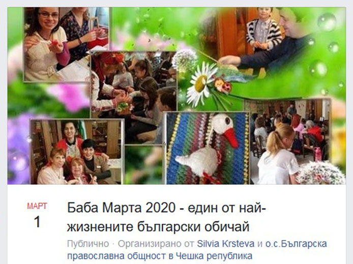 Българска православна общност в Чешката република организира в Прага „БАБА МАРТА 2020 – ЕДИН ОТ НАЙ-ЖИЗНЕНИТЕ БЪЛГАРСКИ ОБИЧАИ“. Празникът с творческа работилница за изработването на мартеници ще се състои на 1 март т.г., от 14:00 ч. до 18:00 ч. местно време, в Българския дом на ул. „Америцка“ 28.