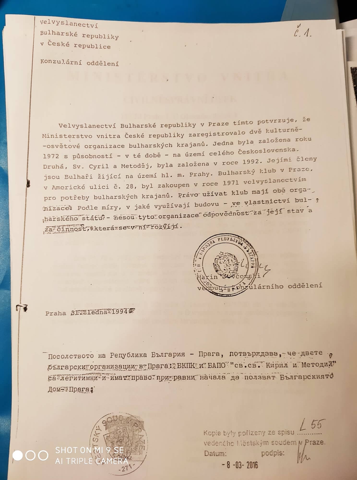 Цялата тази сага със съдебното дело, която започна преди почти пет години, се случва, въпреки че в българските дипломатически архиви има, според запознати, достатъчно документи по случая, показващи, че българските организации не са самонастанили се в Българския дом на ул. „Америцка“ и българската държава е имала през годините документирани отношения с тях. Ето например факсимиле от един документ, издаден от Българското посолство в Прага през 1994 г., копие от който е бил предоставен на чешките съдебни власти на 8.03.2016 г.