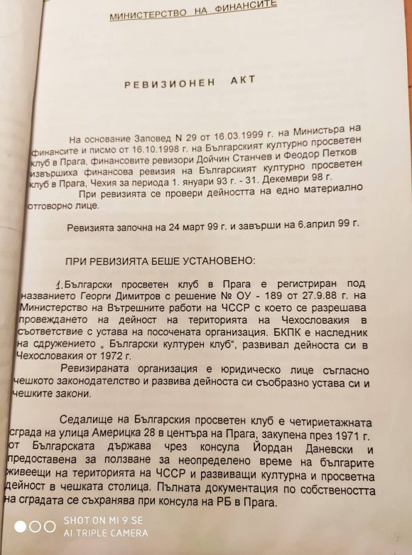 А това е факсимиле от първата страница на ревизионен акт на Министерство на финансите на Р. България, издаден през пролетта на 1999 г.